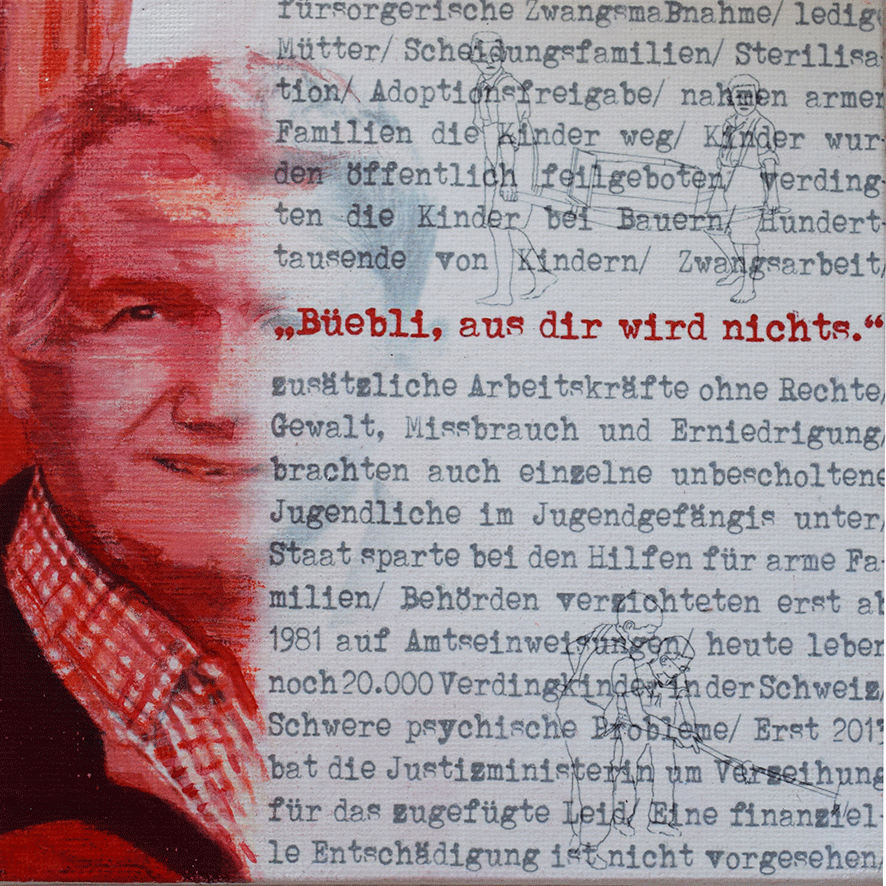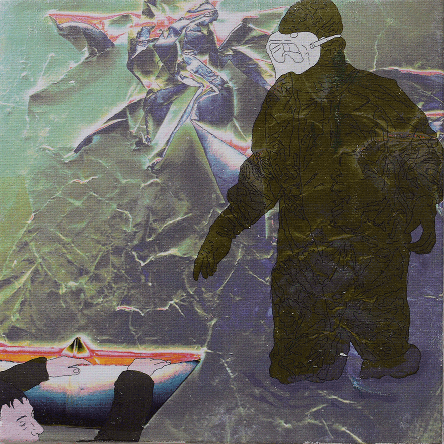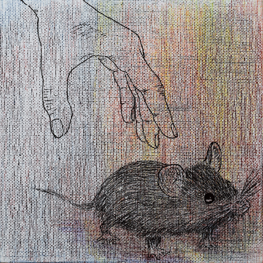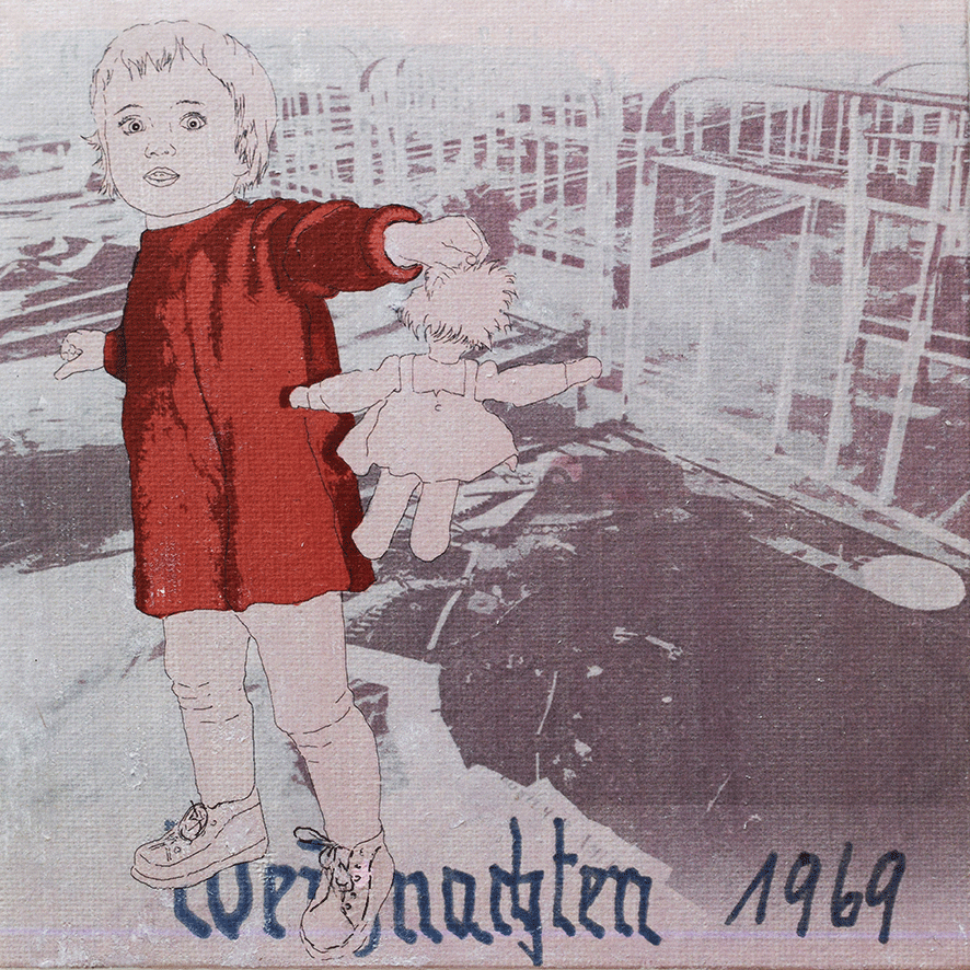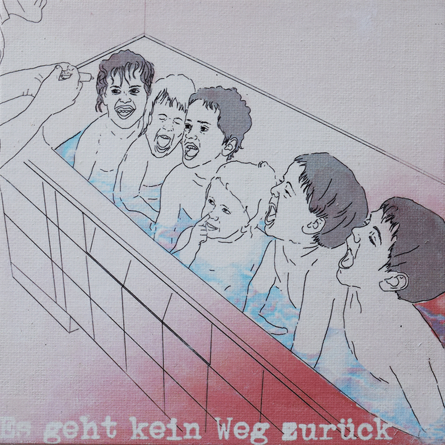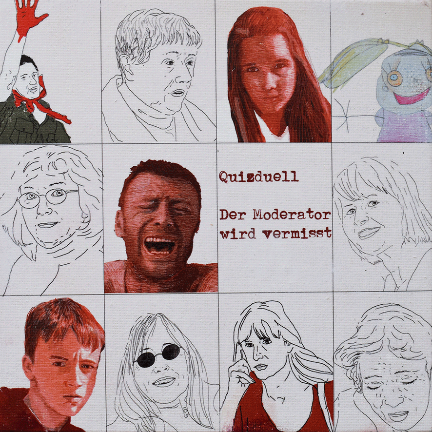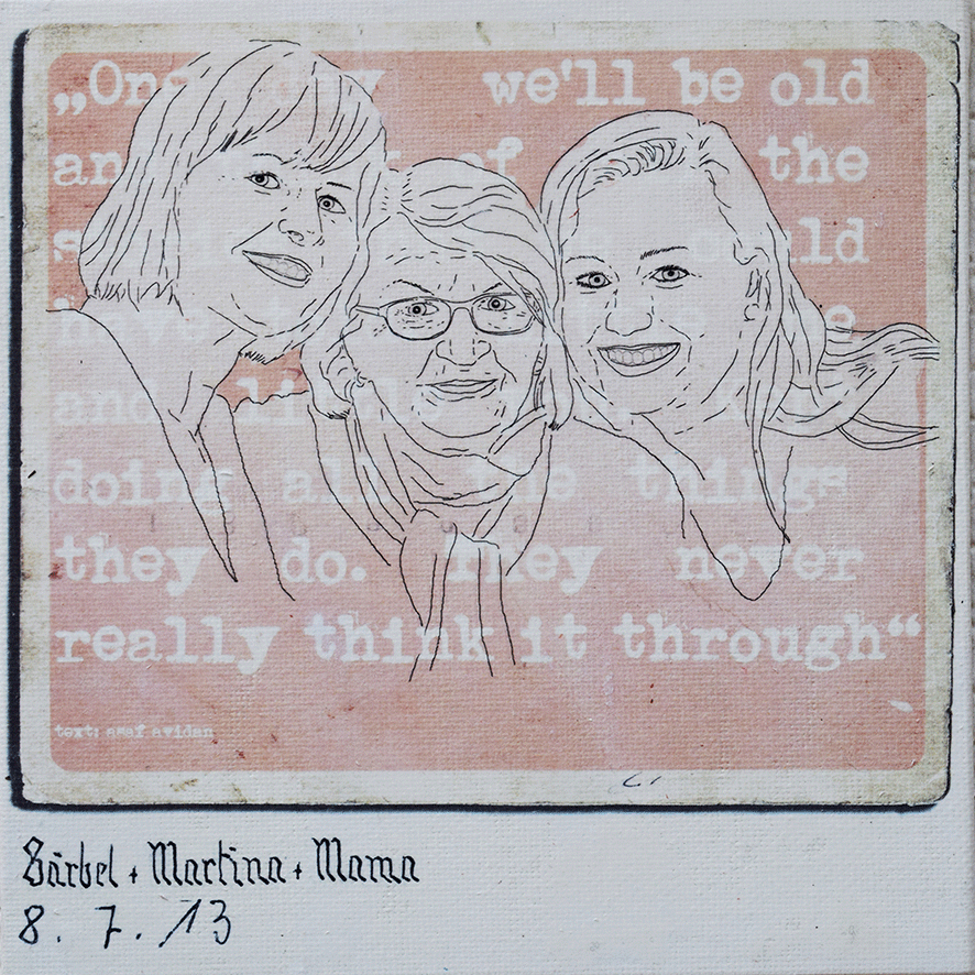 Die Arbeiten umgesetzt habe ich auf 15 x 15cm großen Tafeln. Ich habe gezeichnet - digital und mit Farbstiften - , mit Acrylfarbe gemalt, aquarelliert, collagiert und gedruckt.